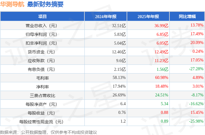 据证券之星公开数据整理,近期华测导航(300627)发布2025年年报。截至本报告期末,公司营业总收入36.99亿元,同比上升13.78%,归母净利润6.85亿元,同比上升17.49%。按单季度数据看,第四季度营业总收入10.81亿元,同比上升9.9%,第四季度归母净利润1.93亿元,同比下降0.46%。本报告期华测导航盈利能力上升,毛利率同比增幅4.89%,净利率同比增幅3.01%。