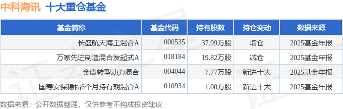 持有中科海讯最多的基金为长盛航天海工混合A,目前规模为2.09亿元,最新净值1.8631(4月17日),较上一交易日上涨1.88%,近一年上涨50.72%。该基金现任基金经理为王柄方。