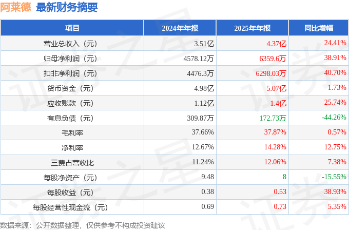据证券之星公开数据整理,近期阿莱德(301419)发布2025年年报。截至本报告期末,公司营业总收入4.37亿元,同比上升24.41%,归母净利润6359.6万元,同比上升38.91%。按单季度数据看,第四季度营业总收入1.2亿元,同比上升22.62%,第四季度归母净利润1135.54万元,同比下降37.4%。本报告期阿莱德盈利能力上升,毛利率同比增幅0.57%,净利率同比增幅12.75%。