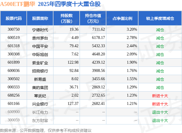 A500ETF鹏华基金成立于2024年11月21日,基金经理为余展昌,基金跟踪标的为中证A500指数,成立以来超额回报为6.22%,近一个月超额回报为0.04%。最新披露的基金持仓数据显示,截止2025年12月31日,该基金第一大重仓股为宁德时代(300750),持股占比为3.2%。