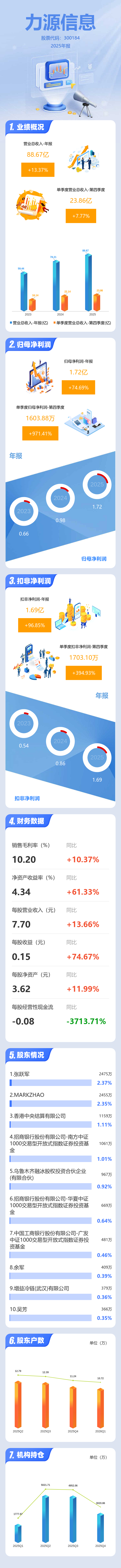 证券之星消息,力源信息2025年年报显示,当年度公司主营收入88.67亿元,同比上升13.37%;归母净利润1.72亿元,同比上升74.69%;扣非净利润1.69亿元,同比上升96.85%;其中2025年第四季度,公司单季度主营收入23.86亿元,同比上升7.77%;单季度归母净利润1603.88万元,同比上升971.42%;单季度扣非净利润1703.1万元,同比上升394.93%;负债率40.18%,投资收益-421.28万元,财务费用3619.35万元,毛利率10.2%。