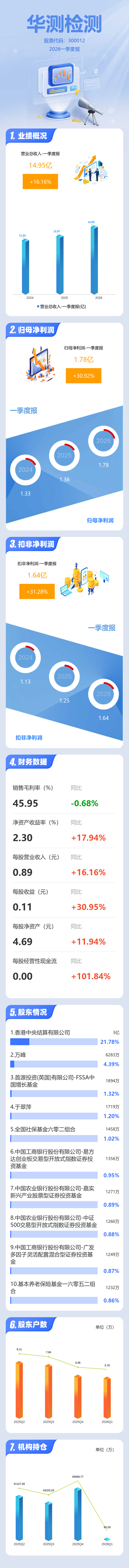 证券之星消息,华测检测2026年一季报显示,一季度公司主营收入14.95亿元,同比上升16.17%;归母净利润1.78亿元,同比上升30.93%;扣非净利润1.64亿元,同比上升31.28%;负债率21.69%,投资收益836.84万元,财务费用380.79万元,毛利率45.95%。