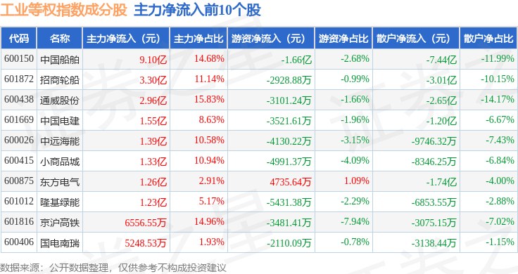 资金流向方面,工业等权(000072)指数成份股当日主力资金净流入合计7.93亿元,游资资金净流入合计5455.17万元,散户资金净流出合计8.48亿元。成份股资金流向详情见下表: