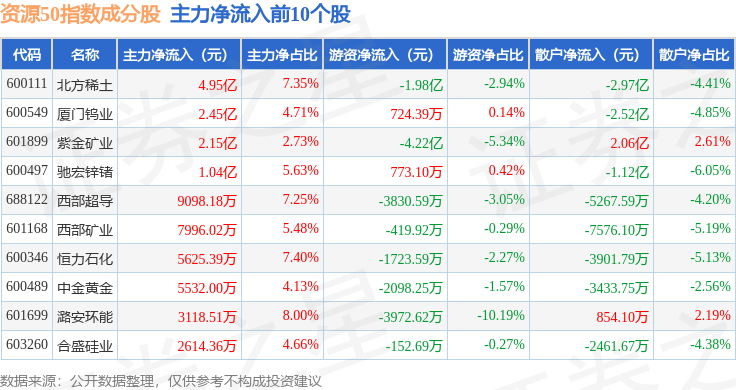 资金流向方面,资源50(000092)指数成份股当日主力资金净流出合计33.08亿元,游资资金净流入合计6.8亿元,散户资金净流入合计26.28亿元。成份股资金流向详情见下表: