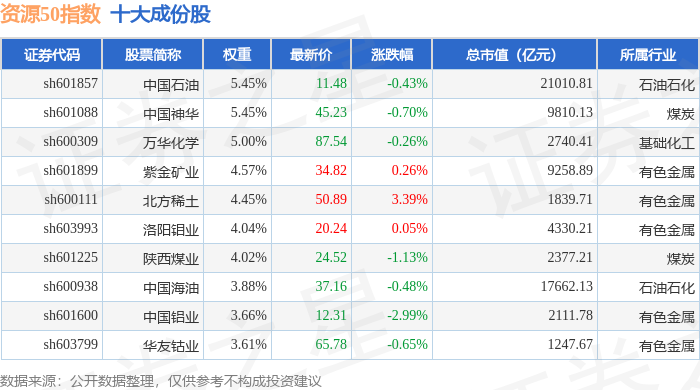 资源50(000092)指数十大成份股详情如下: