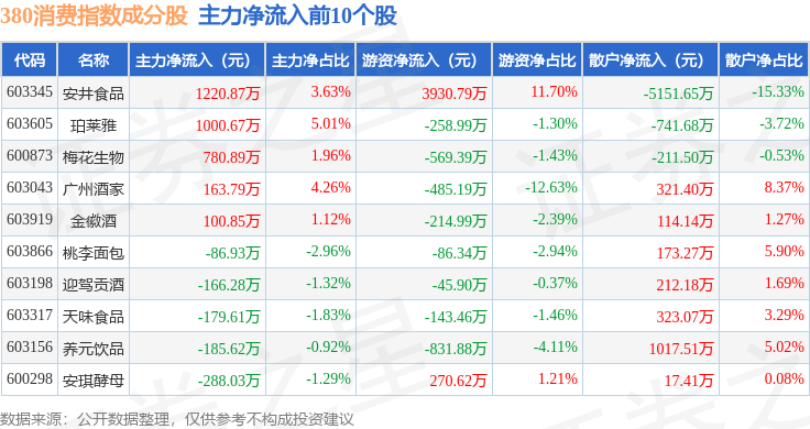 资金流向方面,380消费(000108)指数成份股当日主力资金净流出合计1.02亿元,游资资金净流入合计3557.65万元,散户资金净流入合计6638.74万元。成份股资金流向详情见下表: