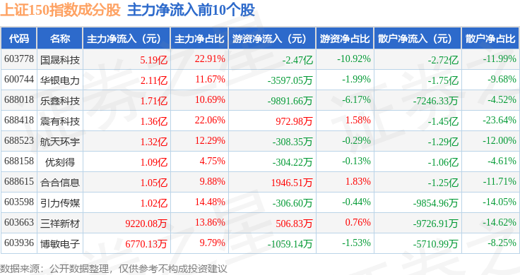 资金流向方面,上证150(000133)指数成份股当日主力资金净流出合计2.21亿元,游资资金净流出合计1.75亿元,散户资金净流入合计3.96亿元。成份股资金流向详情见下表: