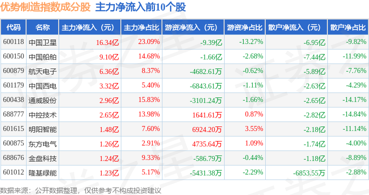 资金流向方面,优势制造(000146)指数成份股当日主力资金净流入合计27.3亿元,游资资金净流出合计6.95亿元,散户资金净流出合计20.35亿元。成份股资金流向详情见下表: