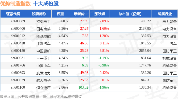 优势制造(000146)指数十大成份股详情如下: