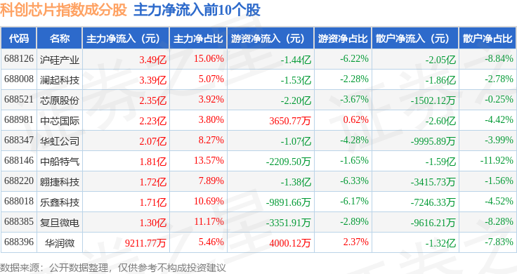 资金流向方面,科创芯片(000685)指数成份股当日主力资金净流出合计5.79亿元,游资资金净流入合计10.11亿元,散户资金净流出合计4.32亿元。成份股资金流向详情见下表: