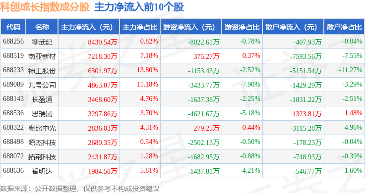 资金流向方面,科创成长(000690)指数成份股当日主力资金净流出合计13.56亿元,游资资金净流入合计4.09亿元,散户资金净流入合计9.47亿元。成份股资金流向详情见下表: