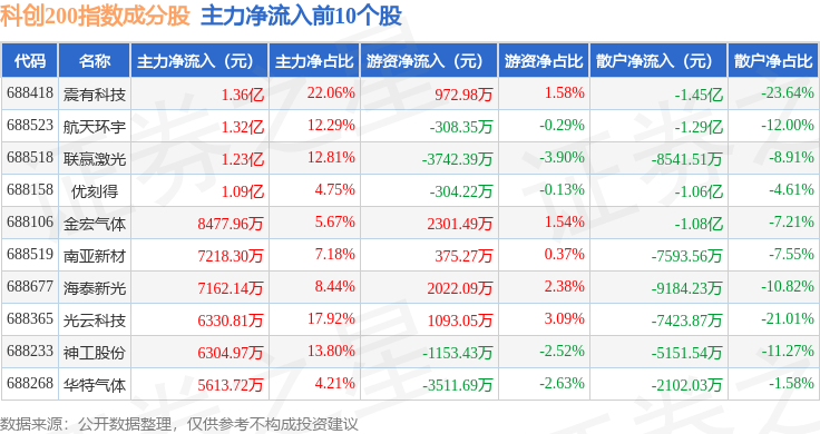 资金流向方面,科创200(000699)指数成份股当日主力资金净流出合计7.84亿元,游资资金净流入合计10.04亿元,散户资金净流出合计2.19亿元。成份股资金流向详情见下表: