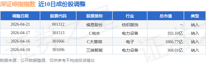 近10日内深证综指(399106)指数成份股做了调整,新纳入了4只股票。