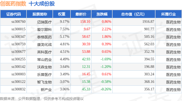证券之星消息,4月20日,创医药(399275)指数报收于248260.0点,涨41.0%,成交163.03亿元,换手率177.0%。当日该指数成份股中,上涨的有29家,迪安诊断以2.41%的涨幅领涨,下跌的有20家,花园生物以2.97%的跌幅领跌。