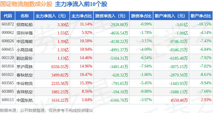 资金流向方面,国证物流(399353)指数成份股当日主力资金净流入合计3.28亿元,游资资金净流出合计2186.51万元,散户资金净流出合计3.06亿元。成份股资金流向详情见下表: