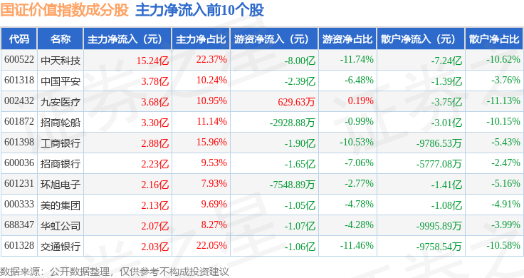 资金流向方面,国证价值(399371)指数成份股当日主力资金净流出合计30.04亿元,游资资金净流入合计2.74亿元,散户资金净流入合计27.3亿元。成份股资金流向详情见下表: