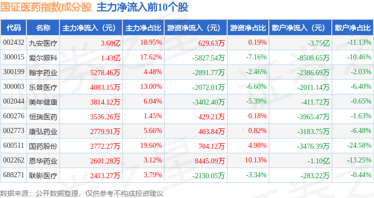 资金流向方面,国证医药(399394)指数成份股当日主力资金净流出合计9.9亿元,游资资金净流入合计4.8亿元,散户资金净流入合计4.8亿元。成份股资金流向详情见下表: