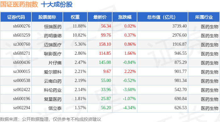 证券之星消息,4月20日,国证医药(399394)指数报收于829524.0点,跌2.0%,成交400.64亿元,换手率120.0%。当日该指数成份股中,上涨的有34家,九安医疗以6.54%的涨幅领涨,下跌的有45家,恩华药业以6.0%的跌幅领跌。