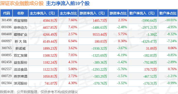 资金流向方面,深证农业(399669)指数成份股当日主力资金净流出合计9.36亿元,游资资金净流入合计2.65亿元,散户资金净流入合计6.71亿元。成份股资金流向详情见下表: