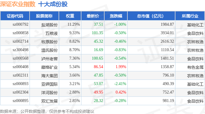 证券之星消息,4月20日,深证农业(399669)指数报收于831082.0点,跌28.0%,成交209.15亿元,换手率140.0%。当日该指数成份股中,上涨的有22家,藏格矿业以1.99%的涨幅领涨,下跌的有25家,鲁西化工以2.9%的跌幅领跌。
