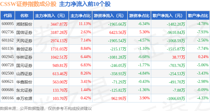 资金流向方面,CSSW证券(399707)指数成份股当日主力资金净流出合计14.12亿元,游资资金净流入合计5.9亿元,散户资金净流入合计8.23亿元。成份股资金流向详情见下表: