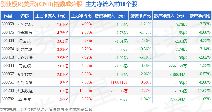 资金流向方面,创业板R(美元)(CNH)(470007)指数成份股当日主力资金净流出合计53.11亿元,游资资金净流入合计49.34亿元,散户资金净流入合计3.77亿元。成份股资金流向详情见下表: