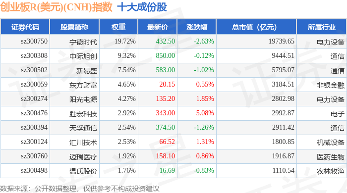 创业板R(美元)(CNH)(470007)指数十大成份股详情如下: