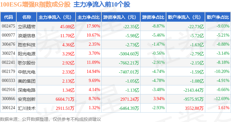 资金流向方面,100ESG增强R(470033)指数成份股当日主力资金净流入合计6.64亿元,游资资金净流入合计10.56亿元,散户资金净流出合计17.2亿元。成份股资金流向详情见下表: