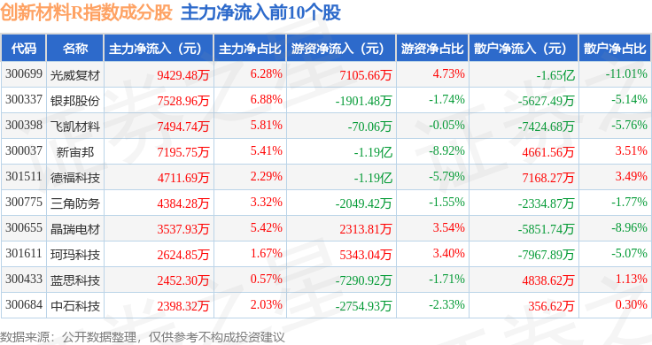 资金流向方面,创新材料R(470039)指数成份股当日主力资金净流出合计35.43亿元,游资资金净流入合计18.28亿元,散户资金净流入合计17.15亿元。成份股资金流向详情见下表: