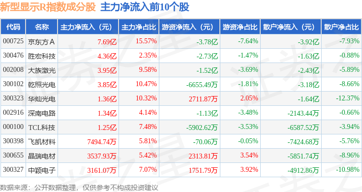 资金流向方面,新型显示R(470048)指数成份股当日主力资金净流出合计23.82亿元,游资资金净流入合计9.96亿元,散户资金净流入合计13.86亿元。成份股资金流向详情见下表: