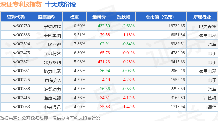 证券之星消息,4月20日,深证专利R(470067)指数报收于646032.0点,涨175.0%,成交1452.8亿元,换手率228.0%。当日该指数成份股中,上涨的有35家,立讯精密以10.01%的涨幅领涨,下跌的有15家,宁德时代以2.63%的跌幅领跌。