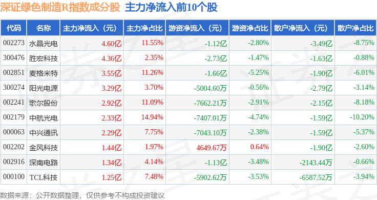 资金流向方面,深证绿色制造R(470069)指数成份股当日主力资金净流出合计17.99亿元,游资资金净流入合计17.4亿元,散户资金净流入合计5903.18万元。成份股资金流向详情见下表: