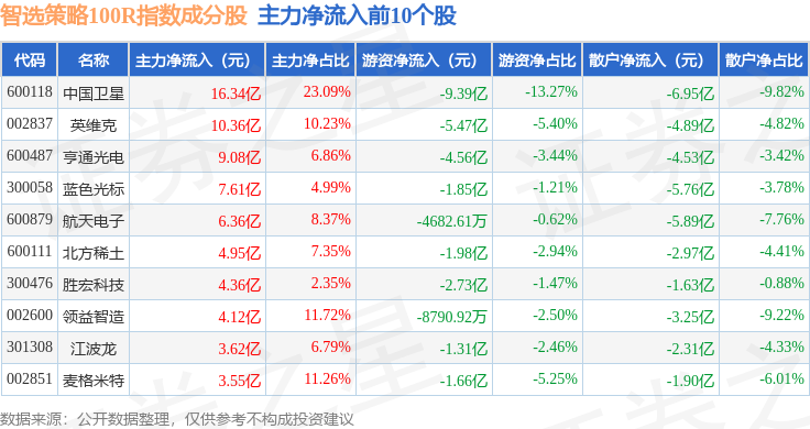 资金流向方面,智选策略100R(489015)指数成份股当日主力资金净流出合计8.67亿元,游资资金净流入合计7.01亿元,散户资金净流入合计1.66亿元。成份股资金流向详情见下表: