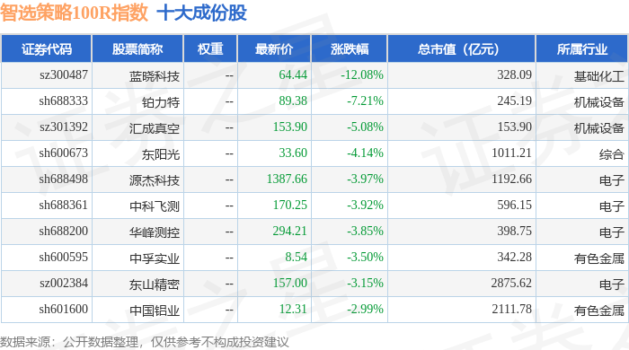 证券之星消息,4月20日,智选策略100R(489015)指数报收于580385.0点,涨112.0%,成交3326.69亿元,换手率360.0%。当日该指数成份股中,上涨的有64家,茂莱光学以13.23%的涨幅领涨,下跌的有34家,蓝晓科技以12.08%的跌幅领跌。
