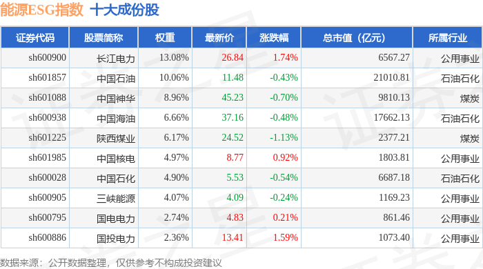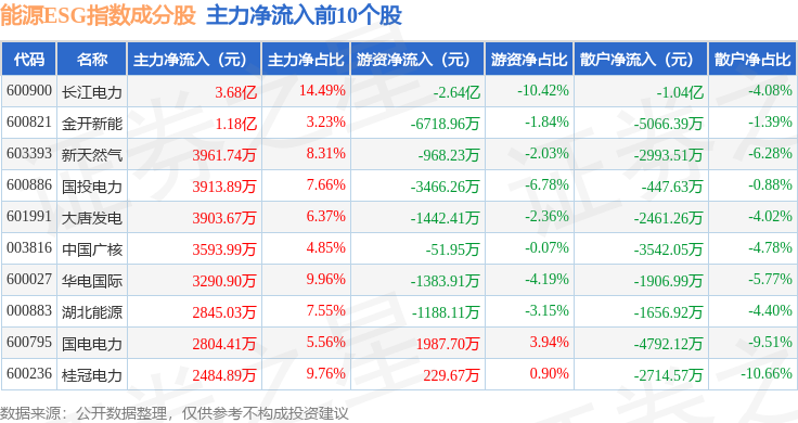 资金流向方面,能源ESG(980133)指数成份股当日主力资金净流出合计4.39亿元,游资资金净流出合计1.74亿元,散户资金净流入合计6.14亿元。成份股资金流向详情见下表: