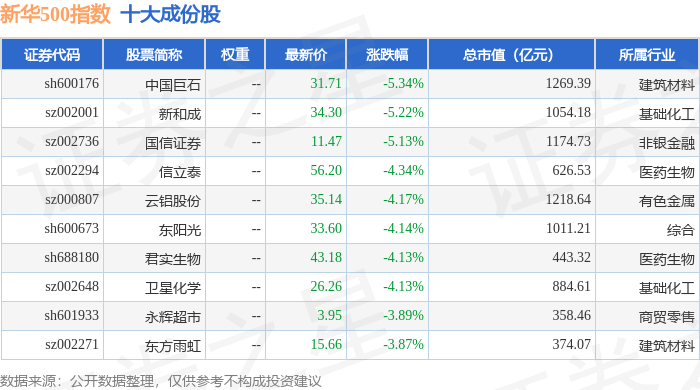 证券之星消息,4月20日,新华500(989001)指数报收于535109.0点,涨66.0%,成交9007.32亿元,换手率83.0%。当日该指数成份股中,上涨的有283家,沪硅产业以14.73%的涨幅领涨,下跌的有201家,中国巨石以5.34%的跌幅领跌。