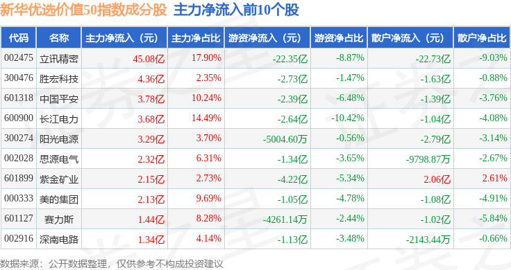 资金流向方面,新华优选价值50(989004)指数成份股当日主力资金净流出合计6.27亿元,游资资金净流入合计14.83亿元,散户资金净流出合计8.56亿元。成份股资金流向详情见下表: