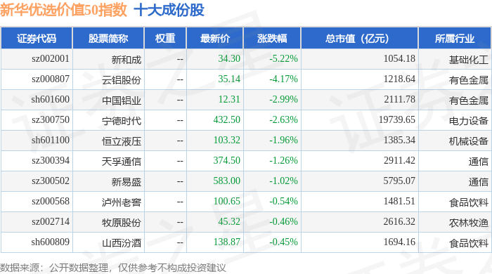 证券之星消息,4月20日,新华优选价值50(989004)指数报收于224807.0点,涨73.0%,成交2533.19亿元,换手率122.0%。当日该指数成份股中,上涨的有33家,立讯精密以10.01%的涨幅领涨,下跌的有16家,新和成以5.22%的跌幅领跌。