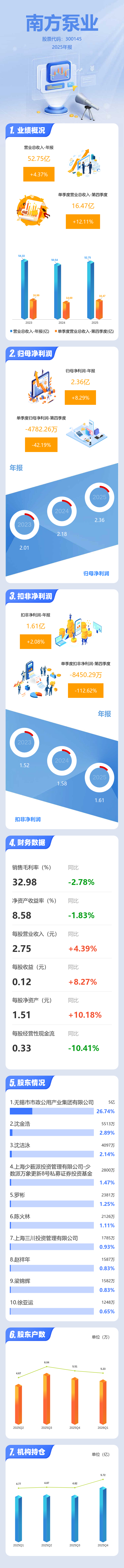证券之星消息,南方泵业2025年年报显示,当年度公司主营收入52.75亿元,同比上升4.38%;归母净利润2.36亿元,同比上升8.29%;扣非净利润1.61亿元,同比上升2.08%;其中2025年第四季度,公司单季度主营收入16.47亿元,同比上升12.12%;单季度归母净利润-4782.26万元,同比下降42.2%;单季度扣非净利润-8450.29万元,同比下降112.63%;负债率61.5%,投资收益1744.26万元,财务费用-4881.61万元,毛利率32.98%。
