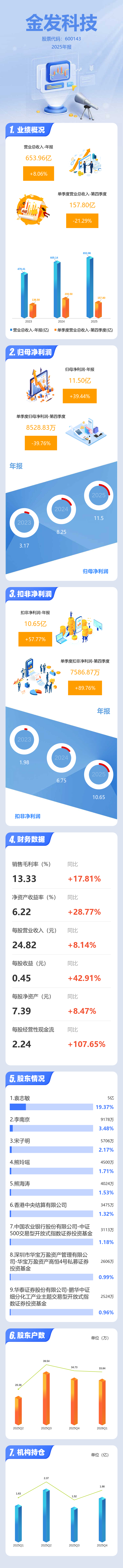 证券之星消息,金发科技2025年年报显示,当年度公司主营收入653.96亿元,同比上升8.07%;归母净利润11.5亿元,同比上升39.44%;扣非净利润10.65亿元,同比上升57.78%;其中2025年第四季度,公司单季度主营收入157.8亿元,同比下降21.29%;单季度归母净利润8528.83万元,同比下降39.76%;单季度扣非净利润7586.87万元,同比上升89.76%;负债率64.58%,投资收益2087.53万元,财务费用9.93亿元,毛利率13.33%。