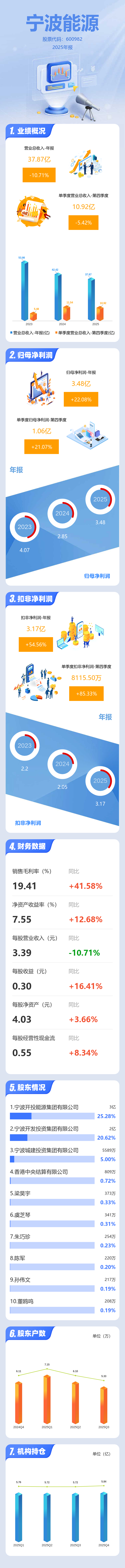 证券之星消息,宁波能源2025年年报显示,当年度公司主营收入37.87亿元,同比下降10.72%;归母净利润3.48亿元,同比上升22.09%;扣非净利润3.17亿元,同比上升54.57%;其中2025年第四季度,公司单季度主营收入10.92亿元,同比下降5.42%;单季度归母净利润1.06亿元,同比上升21.08%;单季度扣非净利润8115.5万元,同比上升85.34%;负债率61.63%,投资收益2.85亿元,财务费用1.6亿元,毛利率19.41%。