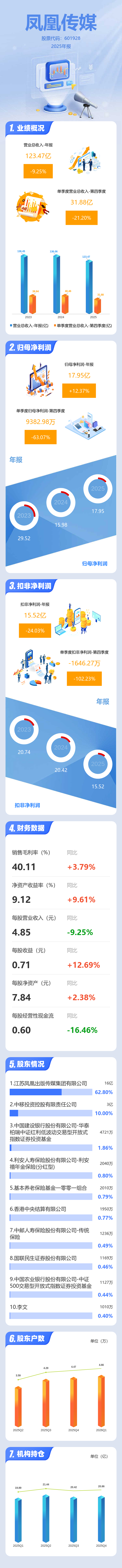 证券之星消息,凤凰传媒2025年年报显示,当年度公司主营收入123.47亿元,同比下降9.25%;归母净利润17.95亿元,同比上升12.37%;扣非净利润15.52亿元,同比下降24.03%;其中2025年第四季度,公司单季度主营收入31.88亿元,同比下降21.2%;单季度归母净利润9382.98万元,同比下降63.08%;单季度扣非净利润-1646.27万元,同比下降102.24%;负债率33.93%,投资收益8727.4万元,财务费用-3.33亿元,毛利率40.11%。