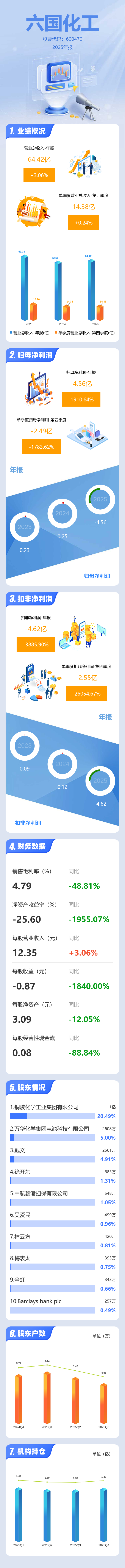 证券之星消息,六国化工2025年年报显示,当年度公司主营收入64.42亿元,同比上升3.06%;归母净利润-4.56亿元,同比下降1910.65%;扣非净利润-4.62亿元,同比下降3885.9%;其中2025年第四季度,公司单季度主营收入14.38亿元,同比上升0.24%;单季度归母净利润-2.49亿元,同比下降1783.62%;单季度扣非净利润-2.55亿元,同比下降26054.67%;负债率73.08%,投资收益1814.69万元,财务费用4169.78万元,毛利率4.79%。