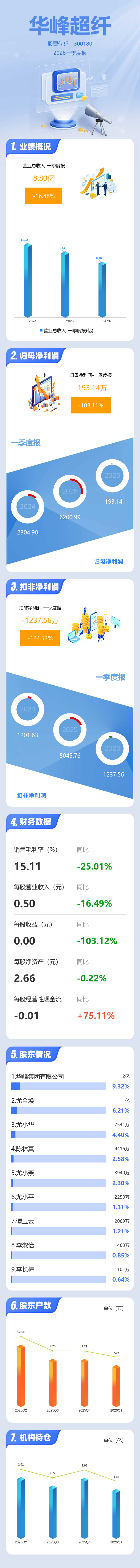 证券之星消息,华峰超纤2026年一季报显示,一季度公司主营收入8.8亿元,同比下降16.49%;归母净利润-193.14万元,同比下降103.11%;扣非净利润-1237.56万元,同比下降124.53%;负债率24.98%,投资收益-154.54万元,财务费用764.73万元,毛利率15.11%。