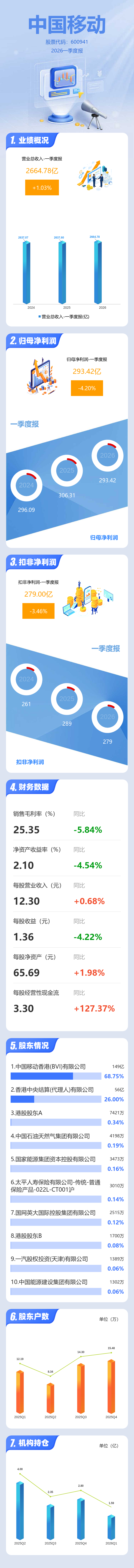 证券之星消息,中国移动2026年一季报显示,一季度公司主营收入2664.78亿元,同比上升1.03%;归母净利润293.42亿元,同比下降4.21%;扣非净利润279.0亿元,同比下降3.46%;负债率33.73%,投资收益68.38亿元,财务费用-3.56亿元,毛利率25.35%。