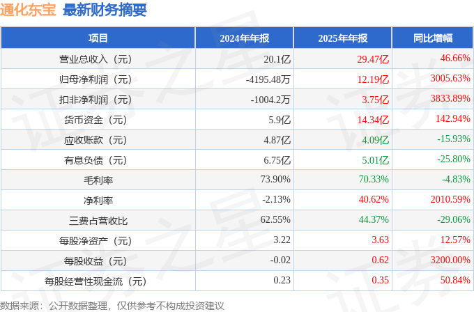 据证券之星公开数据整理,近期通化东宝(600867)发布2025年年报。根据财报显示,通化东宝营收净利润同比双双增长。截至本报告期末,公司营业总收入29.47亿元,同比上升46.66%,归母净利润12.19亿元,同比上升3005.63%。按单季度数据看,第四季度营业总收入7.68亿元,同比上升36.62%,第四季度归母净利润1681.85万元,同比下降31.12%。