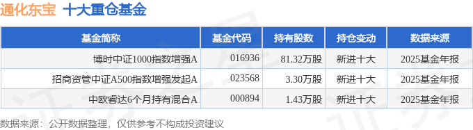 持有通化东宝最多的基金为博时中证1000指数增强A,目前规模为3.89亿元,最新净值1.7145(4月20日),较上一交易日上涨0.19%,近一年上涨52.13%。该基金现任基金经理为桂征辉。