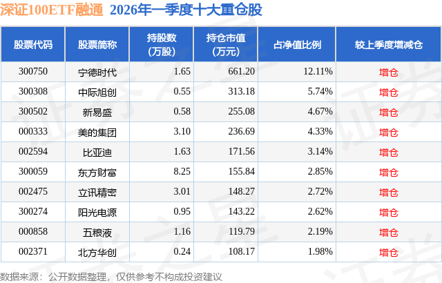 深证100ETF融通基金成立于2025年4月24日,基金经理为何天翔 熊俊杰,基金跟踪标的为深证100指数(价格),成立以来超额回报为-2.33%,近一个月超额回报为-0.08%。最新披露的基金持仓数据显示,截止2026年3月31日,该基金第一大重仓股为宁德时代(300750),持股占比为12.11%。