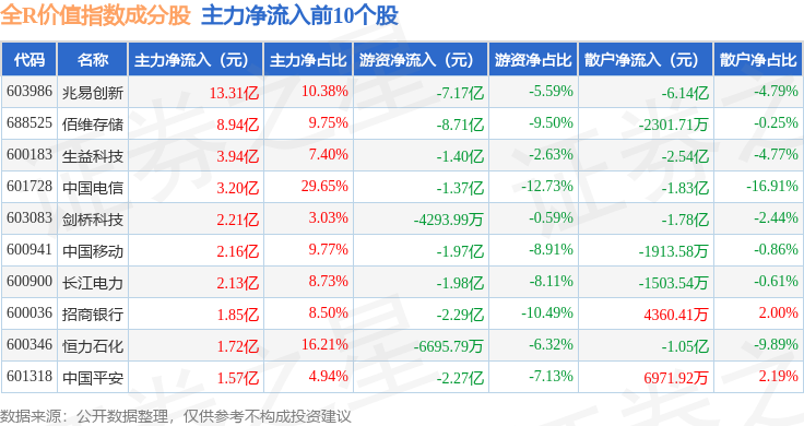 资金流向方面,全R价值(000060)指数成份股当日主力资金净流出合计83.7亿元,游资资金净流入合计9.81亿元,散户资金净流入合计73.88亿元。成份股资金流向详情见下表: