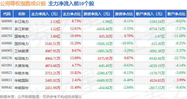 资金流向方面,公用等权(000079)指数成份股当日主力资金净流入合计4.89亿元,游资资金净流出合计2.65亿元,散户资金净流出合计2.24亿元。成份股资金流向详情见下表: